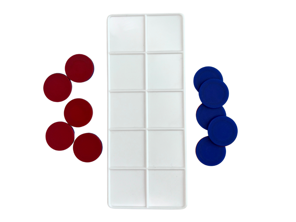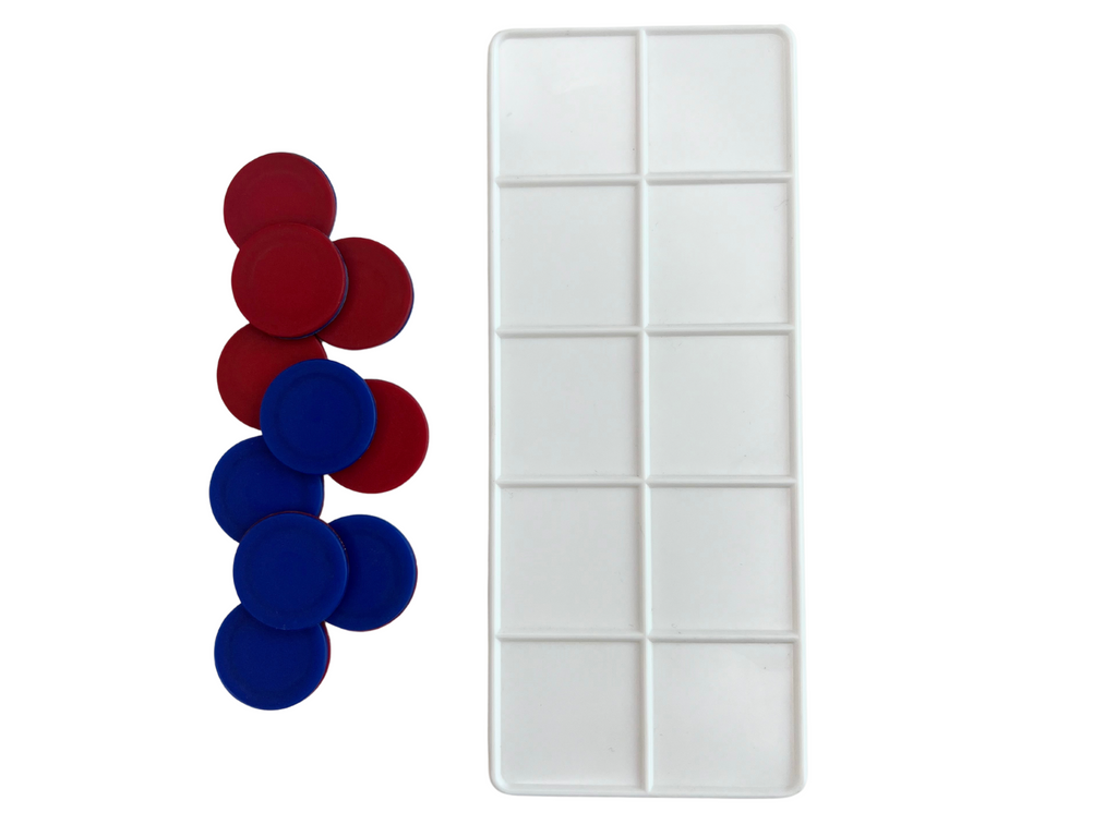 Tabuleiro em plástico rígido (frame) de tamanho aproximado 16,5 cm x 6,5 cm x 4,5mm de espessura com sulcos formando 10 vãos e com 10 circulos em plástico de 2,5 cm de diâmetro com um lado azul e outro vermelho para que possa se fazer contagem, contas e operações matemáticas.